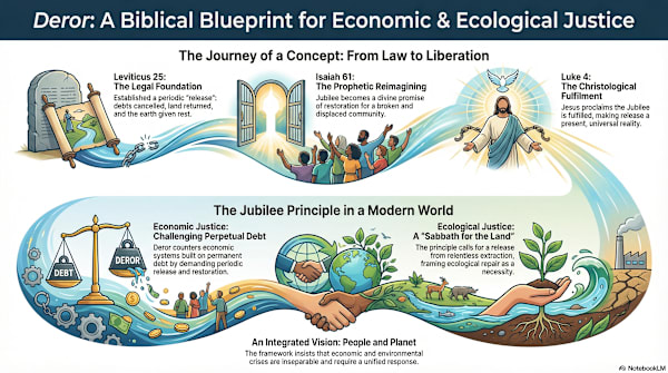 This is the radical idea behind deror, a Hebrew term for "release" or "liberty" found in the tradition of the Jubilee. More than just an ancient law, deror represents a complete theological vision where land, labor, and livelihood are held within the orbit of God’s sovereignty rather than human possession. This tradition offers a surprisingly relevant and coherent way to think about socioeconomic and ecological repair. This post will explore a few of the most impactful ideas from this ancient vision of release.